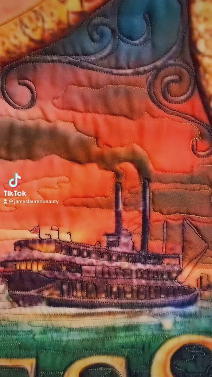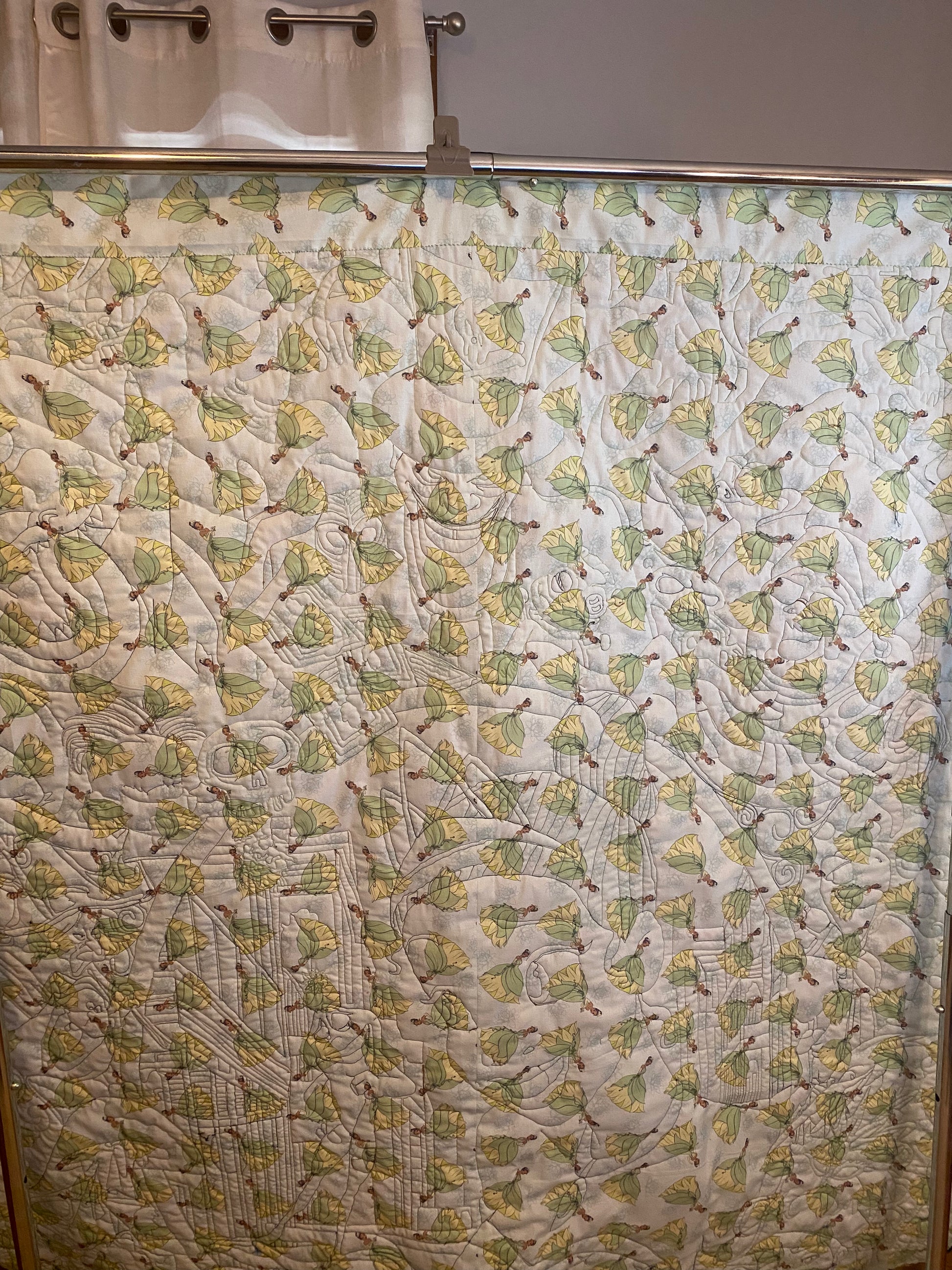 This is a quilt that can be used as a blanket, but we have added a hand sewn sleeve so it can be hung as a decorative wall hanging. It is approximately 58 inches wide and 88 inches long. This piece has over 800,000 stitches, over a dozen color changes, and has a beautiful matching back featuring the main princess.