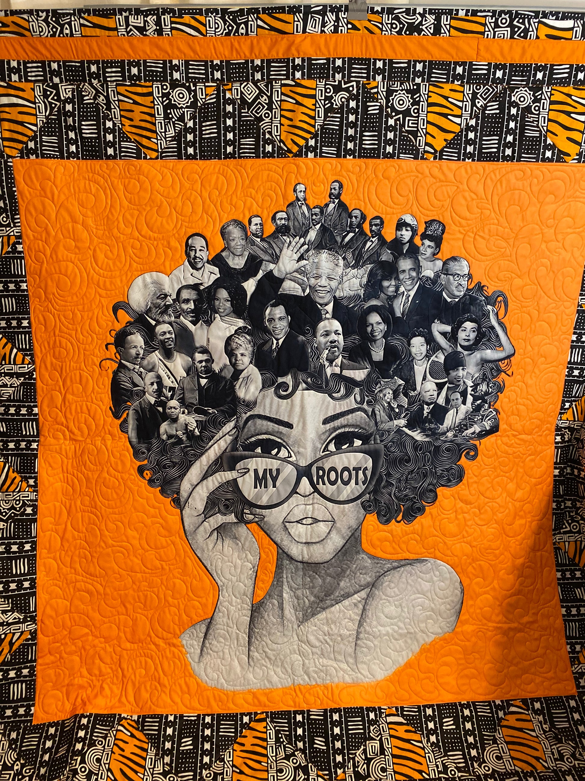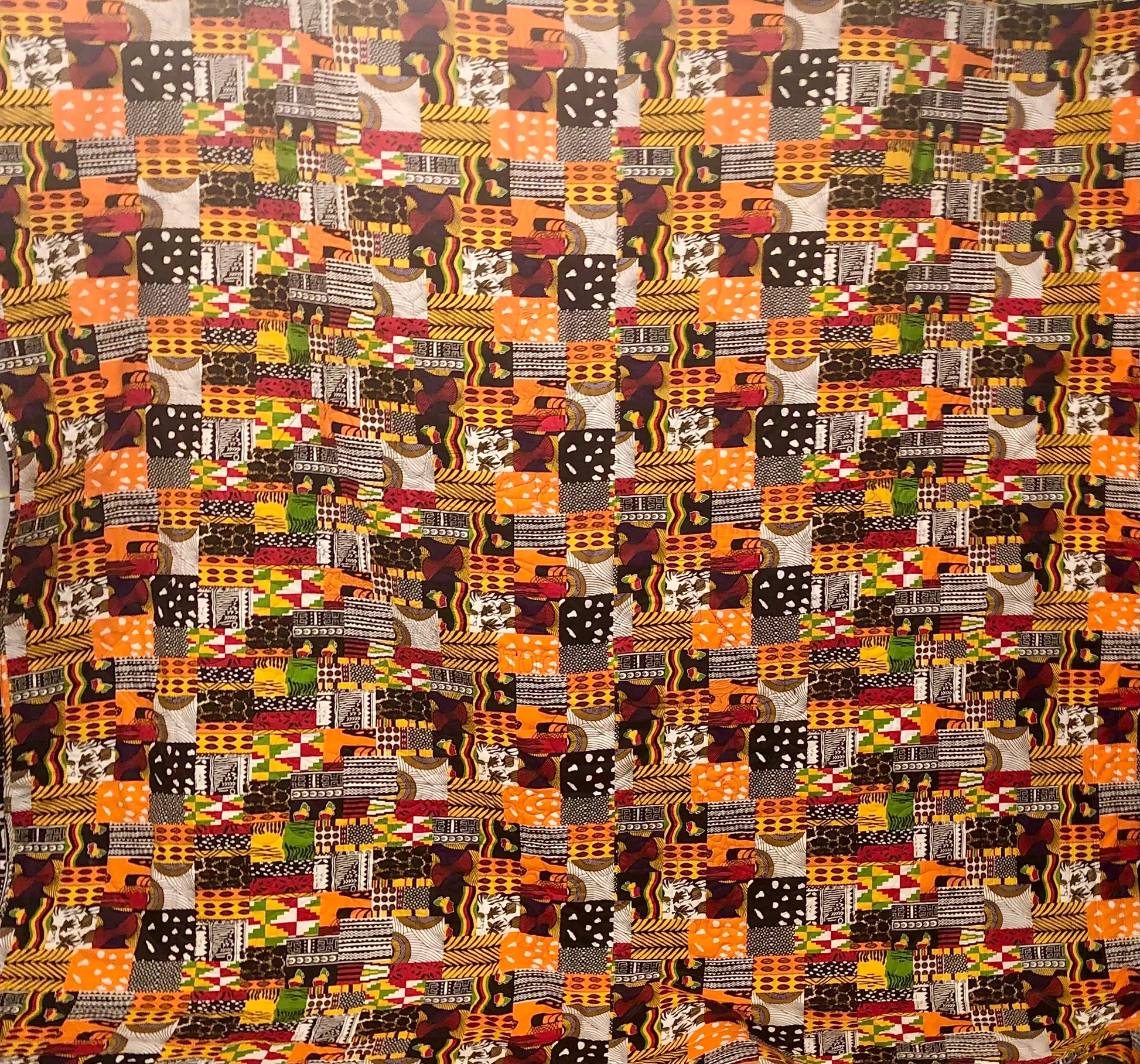 This quilt is 84x84 inches. It utilizes a mix of traditional and Ankara fabrics along with a tapestry to make this one of a kind piece. It took over 10 hours of free motion stitching along with an additional time spent on custom piece work.