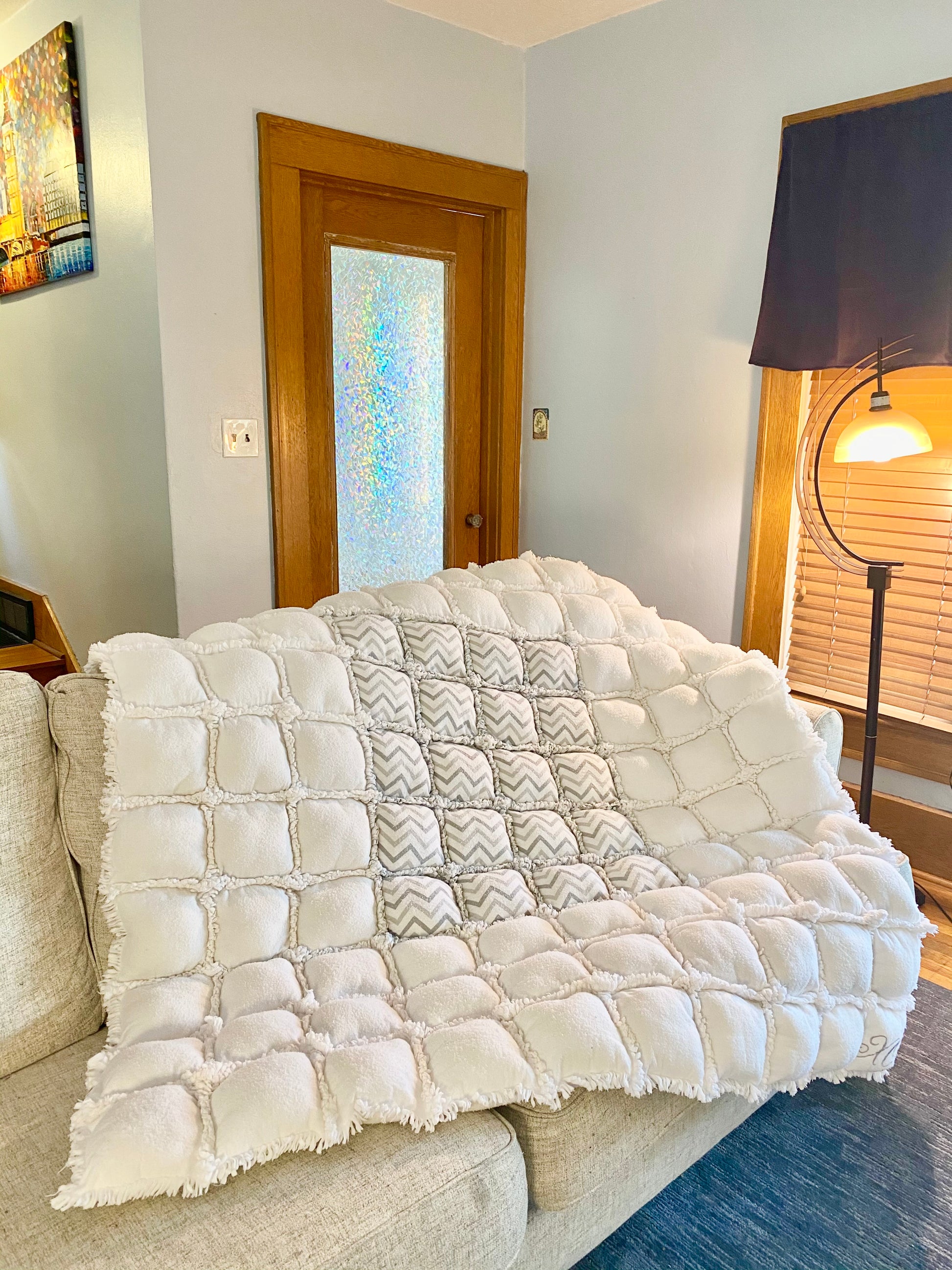 Care Instructions: (Please watch our Tik Tok video for more information.) Machine wash cold with a couple of towels and dry on medium heat. We highly suggest using an industrial washer or dryers such as those found in laundromats to prevent clogging up your appliances with frayed bits from the quilt. This type of fraying is completely normal and an expected part of having a rag quilt.